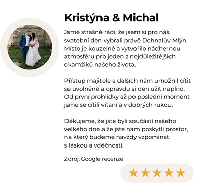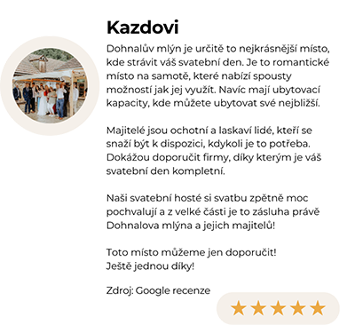 Po závazné rezervaci termínu vás propojíme s vaší kontaktní osobou, která vám bude k dispozici se zodpovězením všech dotazů. V průběhu svatebního pronájmu bude k dispozici i na mlýně, kdyby bylo cokoliv potřeba zajistit.