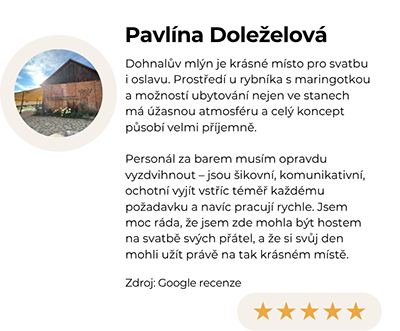 Pro aktuální nabídku volných termínů, ceník pro rok 2027 a další informace nás prosím kontaktujte na e-mail dohnaluvmlyn@gmail.com.