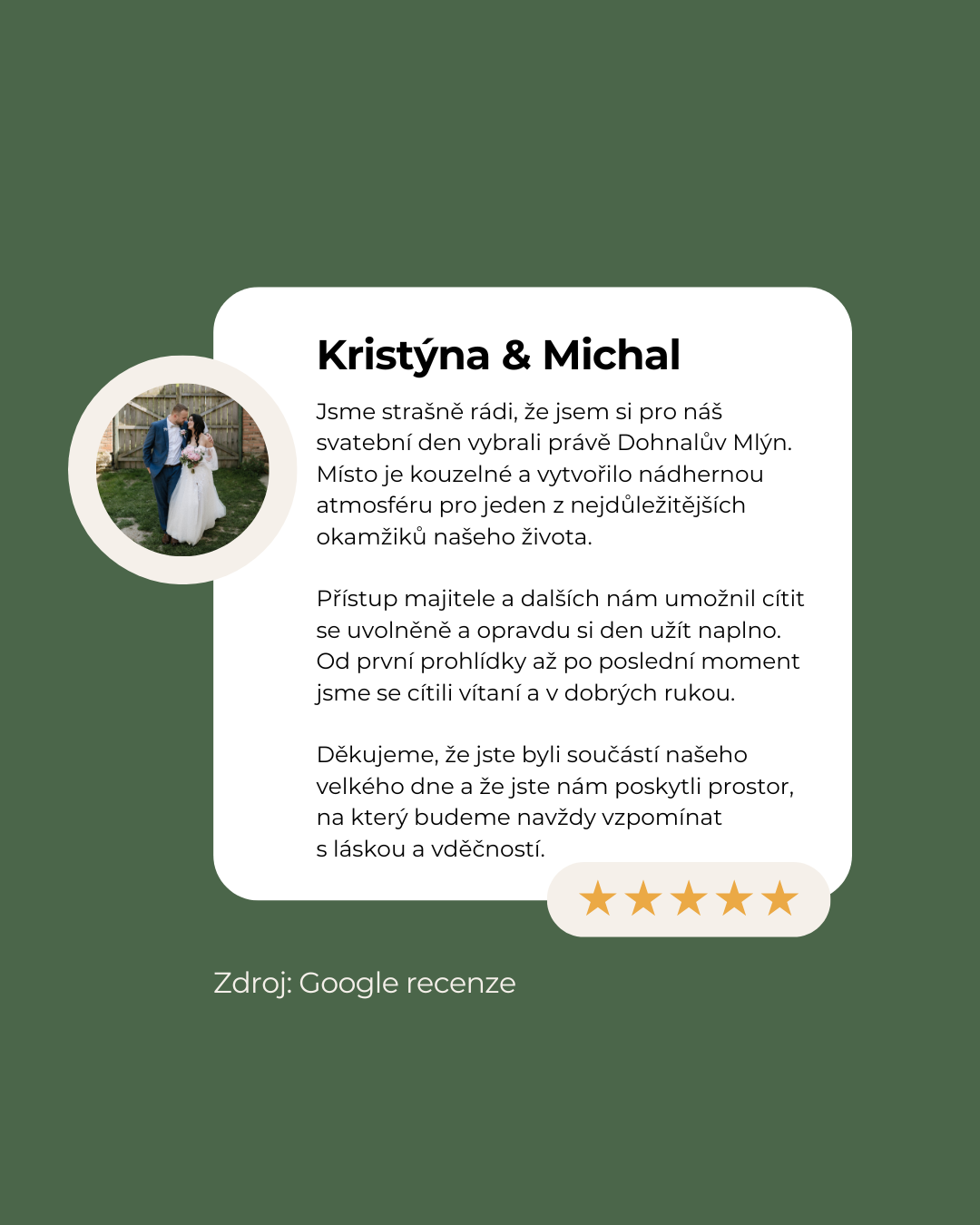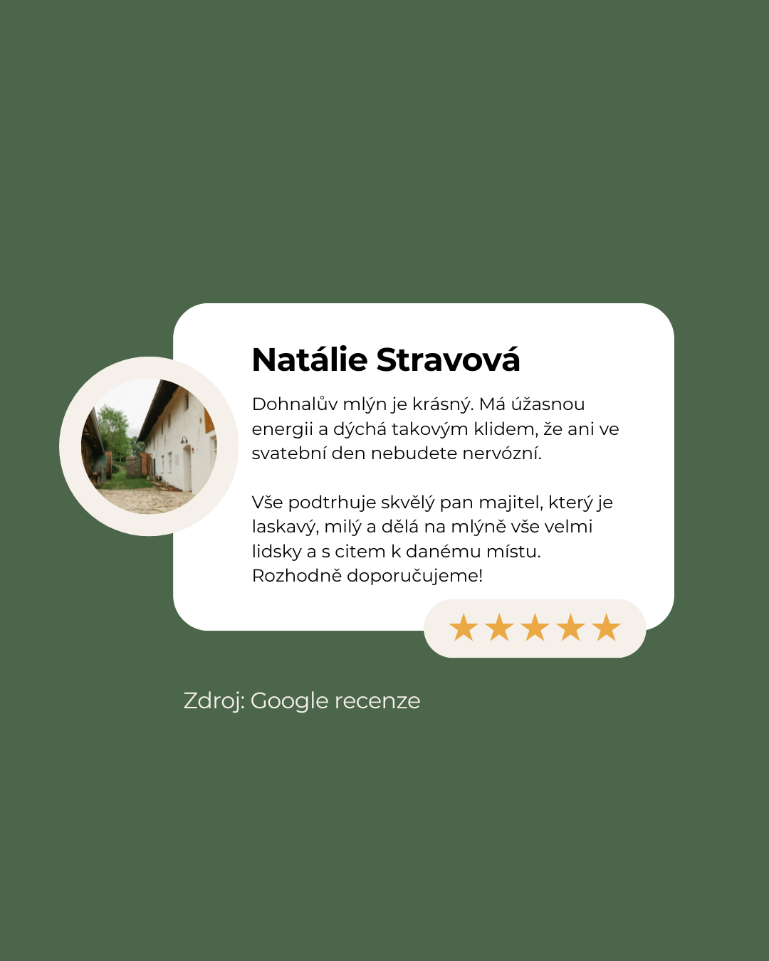 Velkou výhodou našeho místa je i síť ověřených dodavatelů, které vám rádi doporučíme. Jsou to lidé, kteří mlýn dobře znají a vědí, jak prostor funguje v praxi. Díky tomu všechno navazuje přirozeně, bez zbytečných prodlev a stresu.