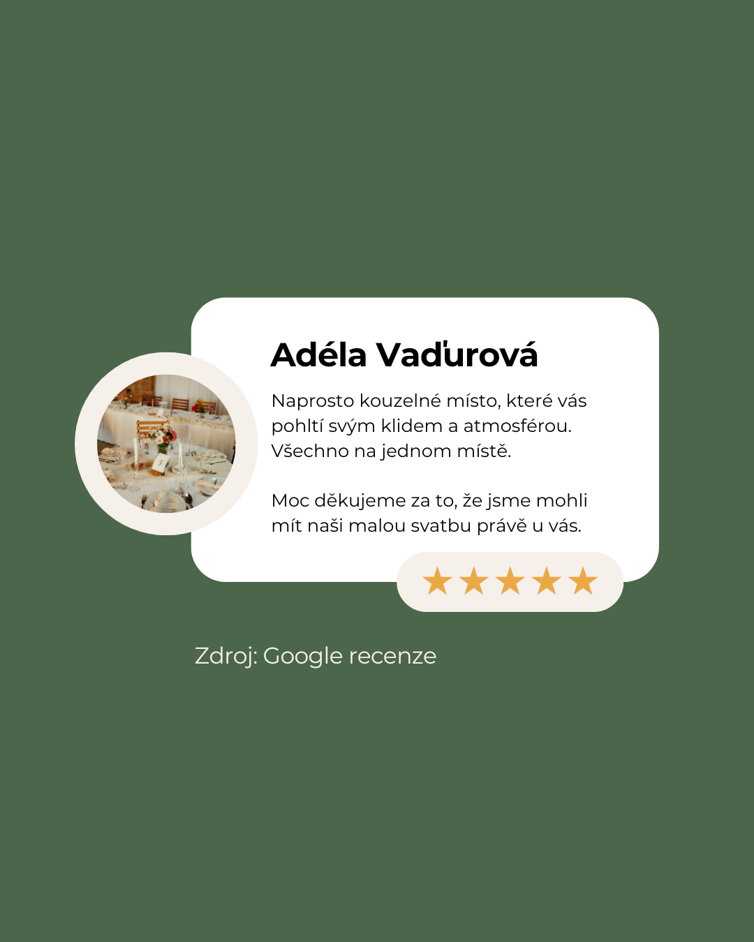 | Možnost časově neomezeného venkovního svatebního veselí | v ceně pronájmu |