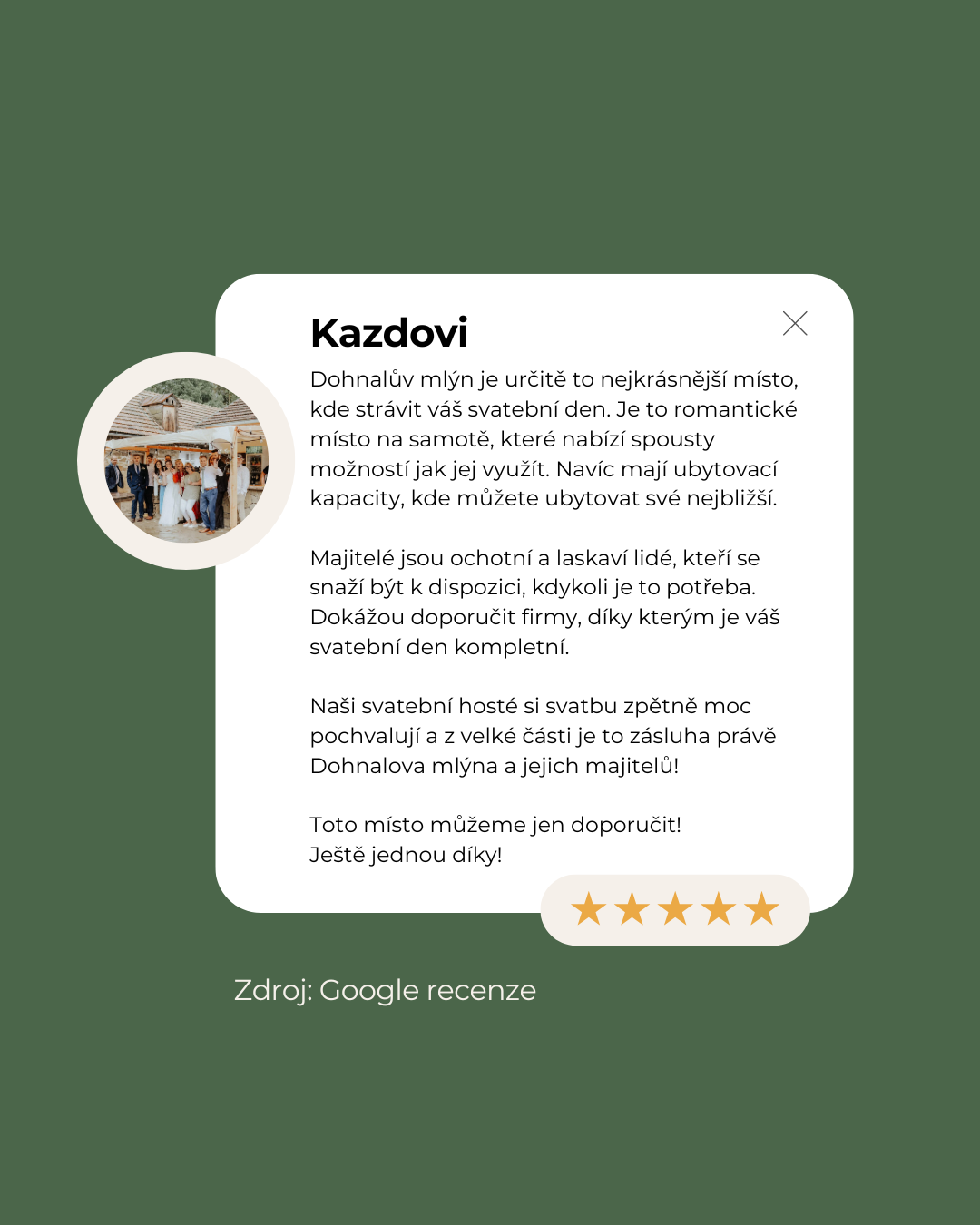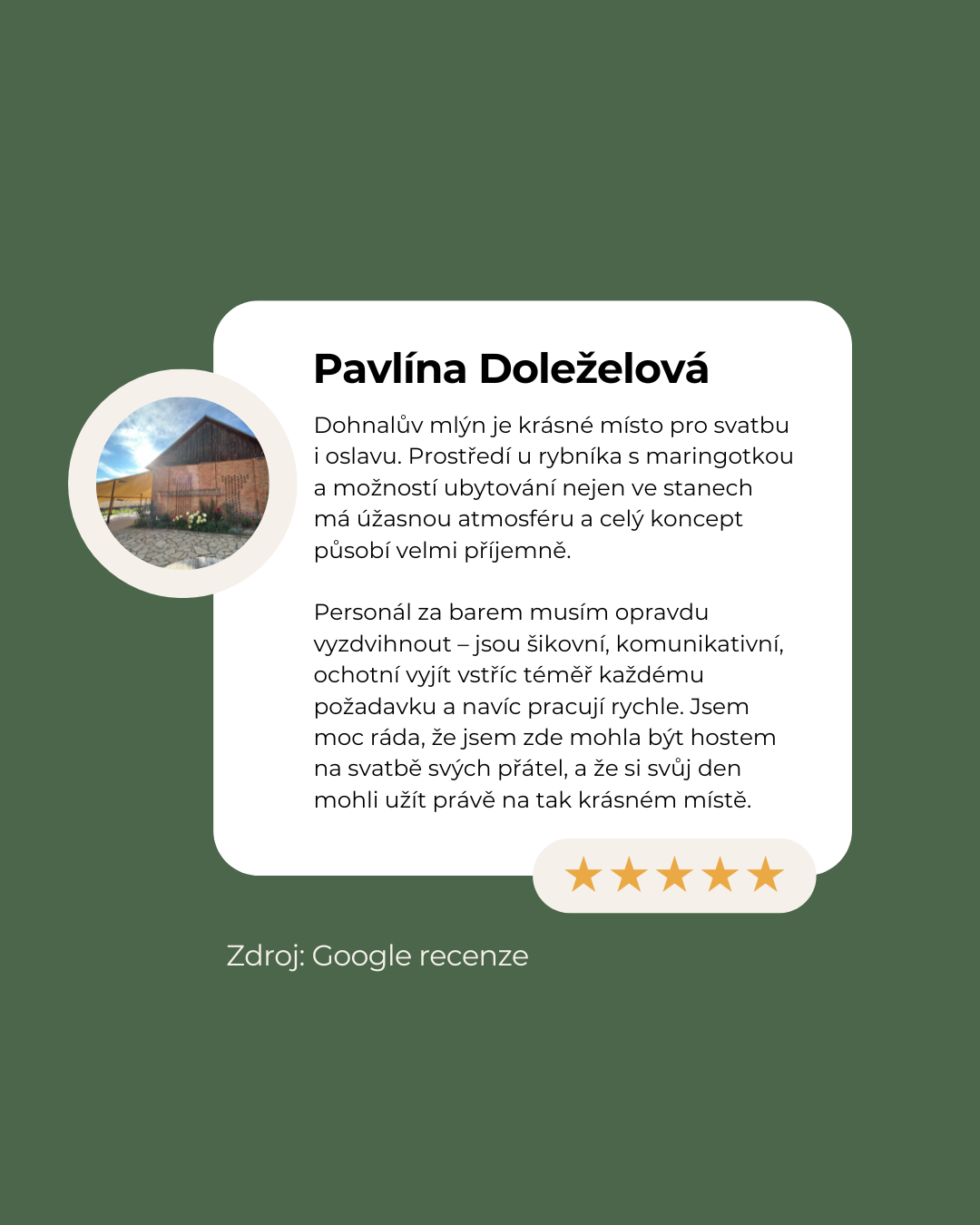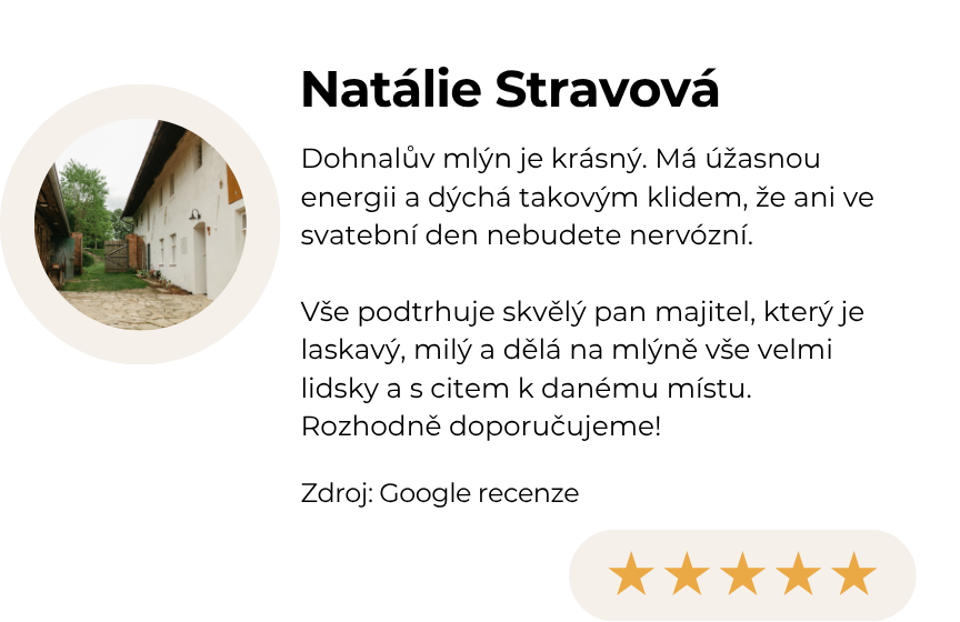 Velkou výhodou našeho místa je i síť ověřených dodavatelů, které vám rádi doporučíme. Jsou to lidé, kteří mlýn dobře znají a vědí, jak prostor funguje v praxi. Díky tomu všechno navazuje přirozeně, bez zbytečných prodlev a stresu.