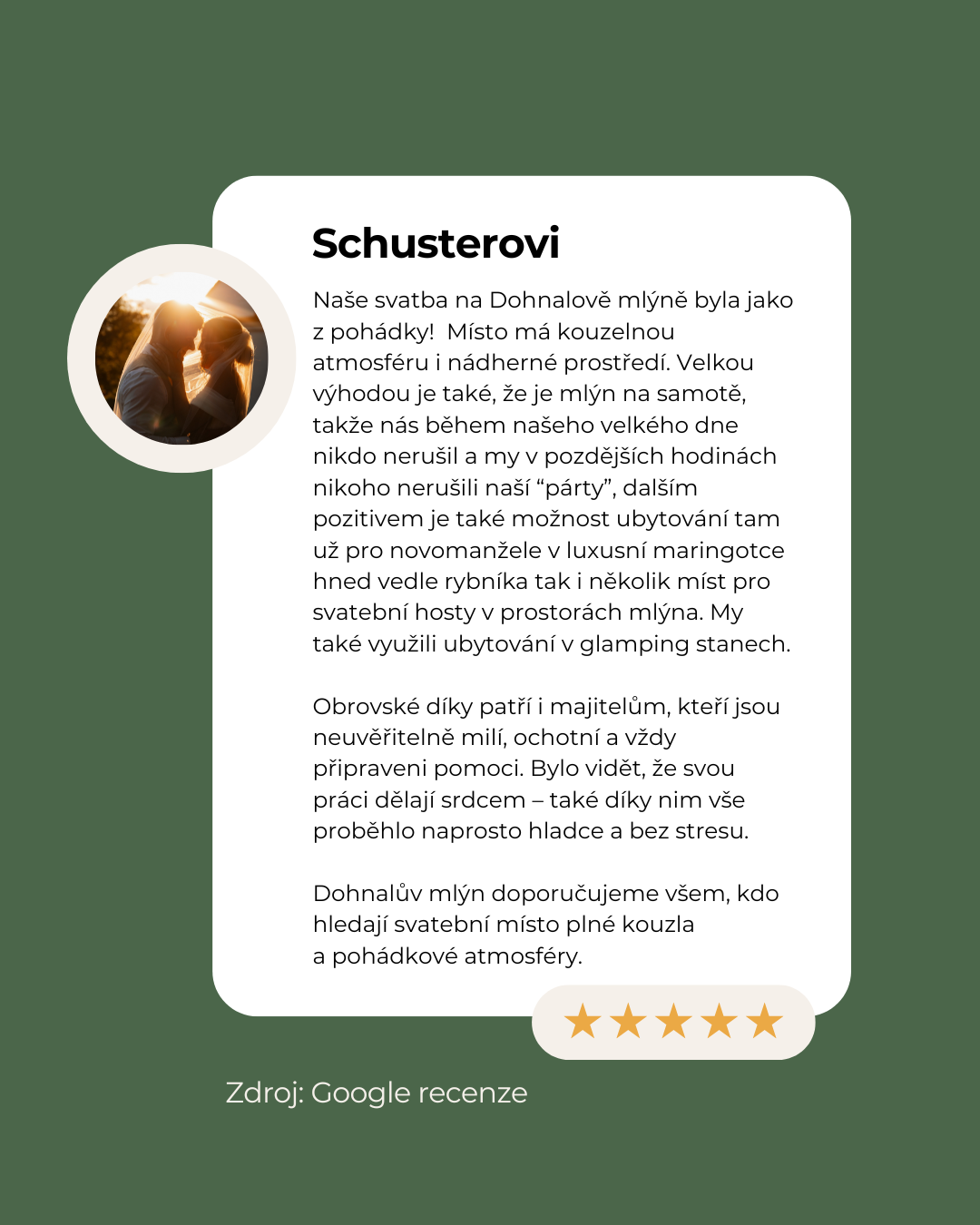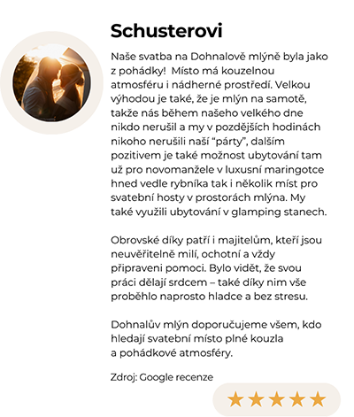 Pro aktuální nabídku volných termínů, ceník pro rok 2027 a další informace nás prosím kontaktujte na e-mail dohnaluvmlyn@gmail.com.